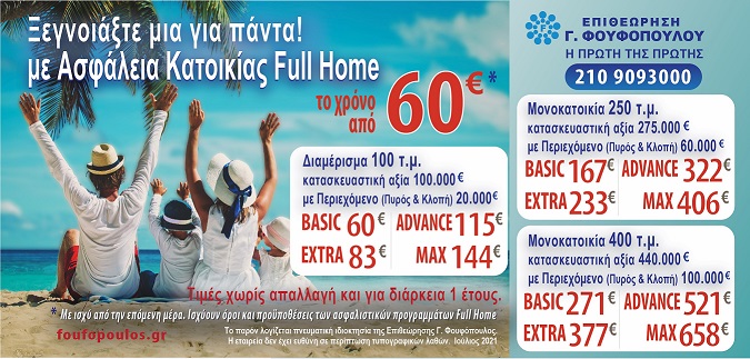 Σας παρέχει την ιδανική λύση ασφάλισης κατοικίας με αυξημένα όρια αποζημίωσης και νέες σύγχρονες καλύψεις σε όλα τα πακέτα, από το Basic έως το Max. Επιπλέον, η Εθνική Ασφαλιστική δίνει τη δυνατότητα επιλογής πακέτου με ή χωρίς ποσό απαλλαγής. Το πρόγραμμα Full Home ασφαλίζει (κάθε ένα από τα πακέτα του) την Οικοδομή και το